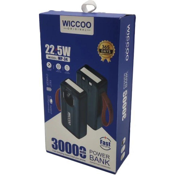 • پاوربانک Wiccoo مدل WP34 با ظرفیت واقعی ۳۰هزار میلی‌آمپر و شارژ سوپر فست ۲۲.۵ وات، مناسب شارژ سریع گوشی، تبلت و دستگاه‌های پرمصرف در سفر و روزانه.